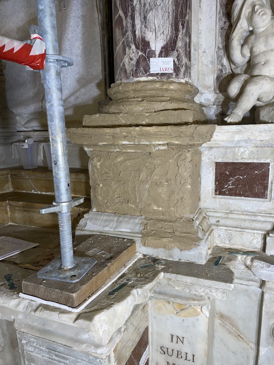 Inoltre, sulle superfici erano presenti depositi di polveri e particellato atmosferico, che causavano l’ingrigimento della superfi cie e una minore leggibilità dei dettagli. Inoltre, si riscontravano: piccole fessurazioni, il distacco del rivestimento in Fior di Pesco dal podio della colonna di destra, la disgregazione di alcune stuccature e l’ossidazione degli elementi metallici, testimonianze silenziose del tempo che passa.