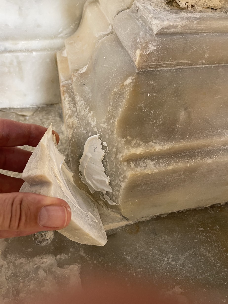 - Dopo una prima fase di pulitura e rimozione di una fi nitura in cera ormai ossidata, il restauro si è concentrato sulla desalinizzazione del marmo, realizzata attraverso impacchi ripetuti che, penetrando nella pietra, scioglievano i sali e li estraevano per capillarità. Tutto il processo si è svolto ascoltando attentamente la materia, seguendone i tempi e le necessità.