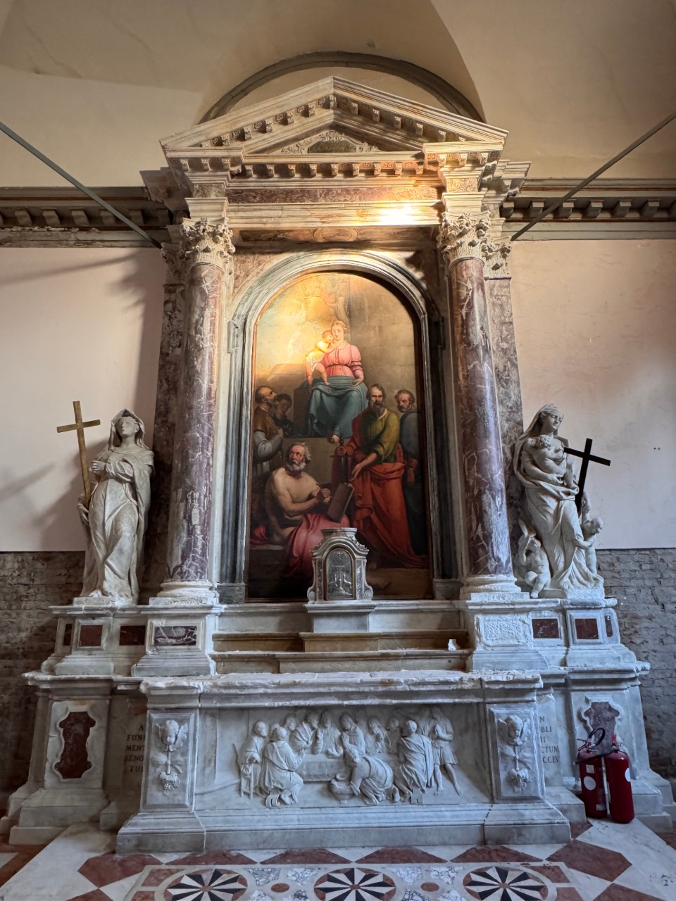 Su due podi laterali, sono poste le statue della Fede e della Carità, accanto a due colonne e due lesene, il cui fusto è rivestito da tarsie in marmo Fior di Pesco quasi impercettibili, un dettaglio che racconta la cura con cui il manufatto è stato realizzato.